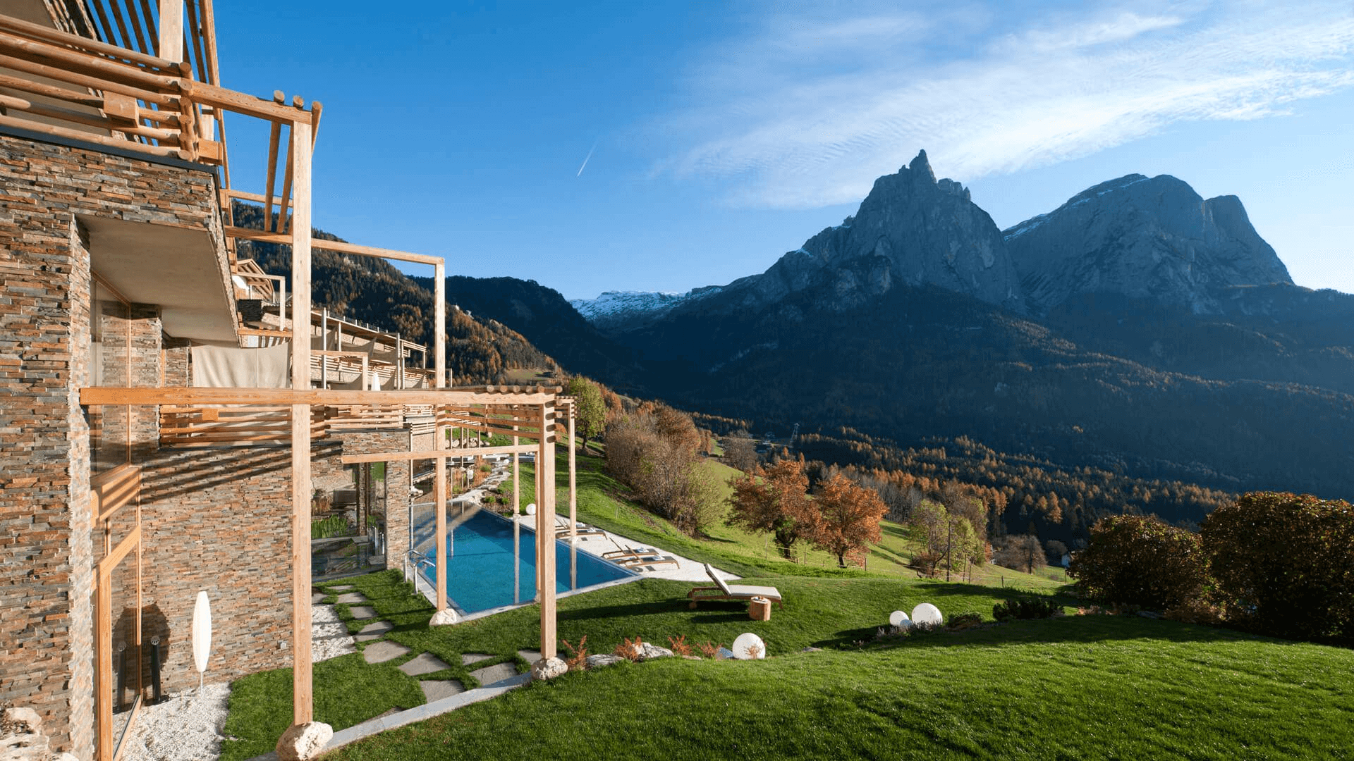 Step inside and enjoy the Schlern's silent theatre. The tall glass fronts unite interior and exterior – whether in the lobby, the rooms, the wellness area or the dining room: everywhere a fascinating view of the Dolomite peaks and across half of South Tyrol opens before you.